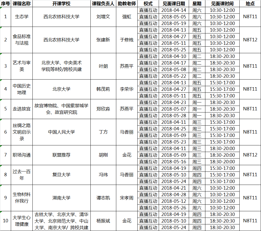 2018春季学期我校所选智慧树平台的艺术与审美等10门在线公选课将在我校进行现场直播见面课,届时参加的师生可通过直播互动平台在线收视和名师进行互动。同时,参加见面会的同学可得到签到分,积极参与课堂教学的同学会得到现场表现分。这些课程的见面课安排如下:
