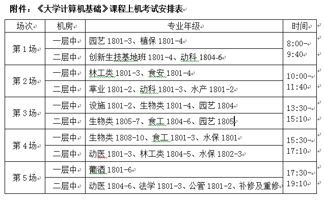 本学期《大学计算机基础》课程上机考试定于第19周周日(2019年1月13日)在信息工程学院实习中心进行。考试具体安排见附件。